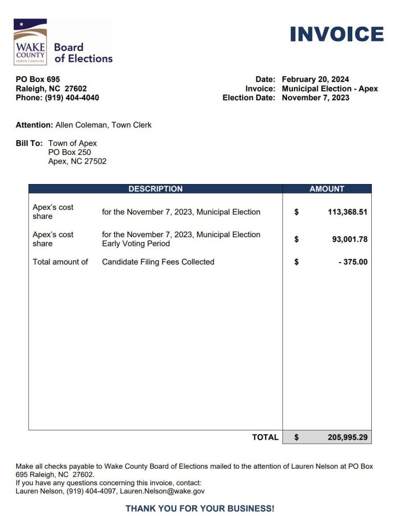 We are billed “per precinct” open. We actually got a discount here, because Cary had a runoff. If they did not, our cost in Nov 2023 would have been even higher. Also to note: now that Raleigh has moved to even year elections, our costs have significantly gone up, and as other municipalities move to even, those costs will further shift to the remaining municipalities on odd years.