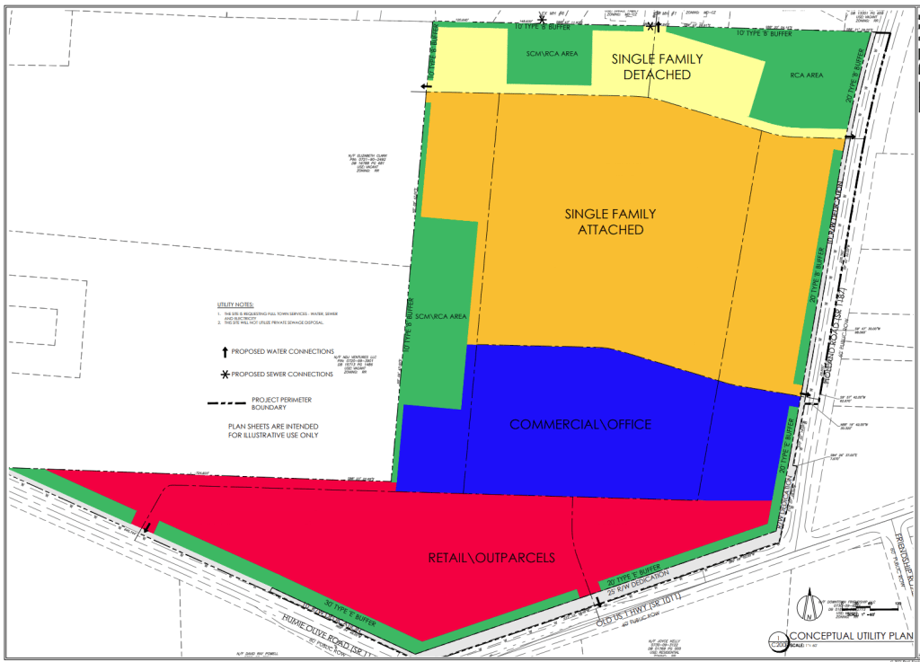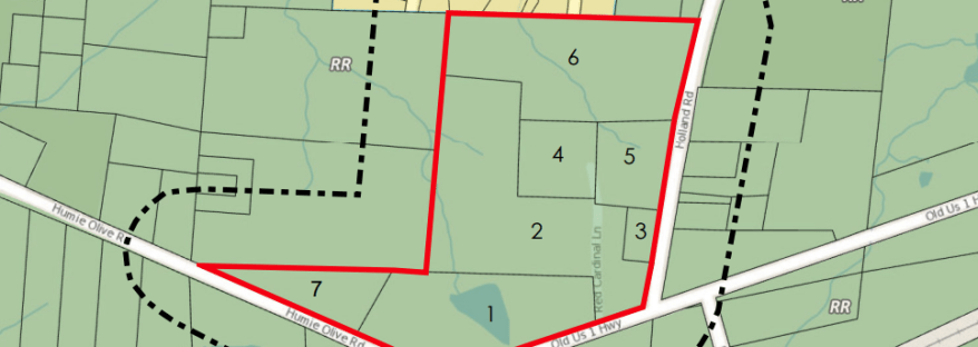A small to medium mixed use development (29 acres) at the corner of Humie Olive, old US 1, and Holland containing medium density (townhomes, but a few single family as a transition from the neighborhood to the north) and some commercial services. Max 100 units total. About 30% commercial.