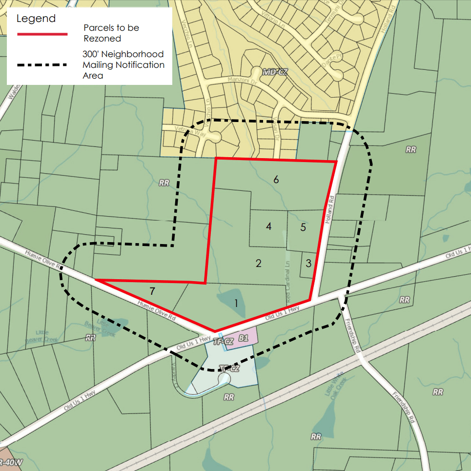 This submission is for an age restricted development on New Hill Olive Chapel Road, just off of 64. This is an amendment to a previously approved development to change the required amenity types, change the timing of the greenway construction (to allow construction to continue in light of a delay with the greenway), and to change an architectural condition on a specific lot to correct a permitting error.